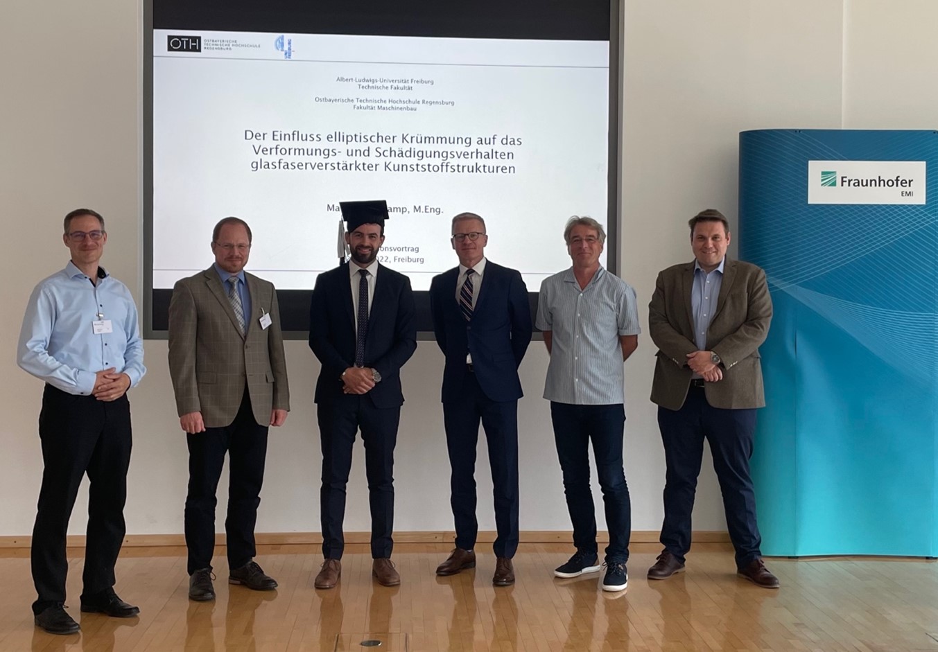 Die Verteidigung der Dissertation, bestehend aus einer zwanzigminütigen Präsentation der Forschungsinhalte und einer abschließenden siebzigminütigen Befragung, fand in den Räumlichkeiten des Ernst-Mach-Instituts (EMI) in Freiburg statt. Der Institutsleiter des EMI, Prof. Dr. habil. Stefan Hiermaier, war als Professor der Albert-Ludwigs-Universität Freiburg Betreuer und Erstgutachter im Promotionsverfahren von Herrn Schlamp. Beheimatet war das Promotionsverfahren in der Technischen Fakultät der Albert-Ludwigs-Universität Freiburg. Die Forschungstätigkeiten selbst fanden an der OTH Regensburg im Labor Faserverbundtechnik (LFT) bei Prof. Dr. Ingo Ehrlich statt, der Betreuer und Zweitgutachter in diesem Verfahren gewesen ist.